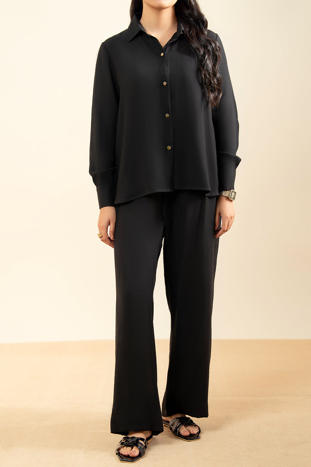 Shirt: Band collar, drop shoulder, full sleeve cuff, back pleats. Material: Muslin Georgette.Wide Pants: Relaxed...