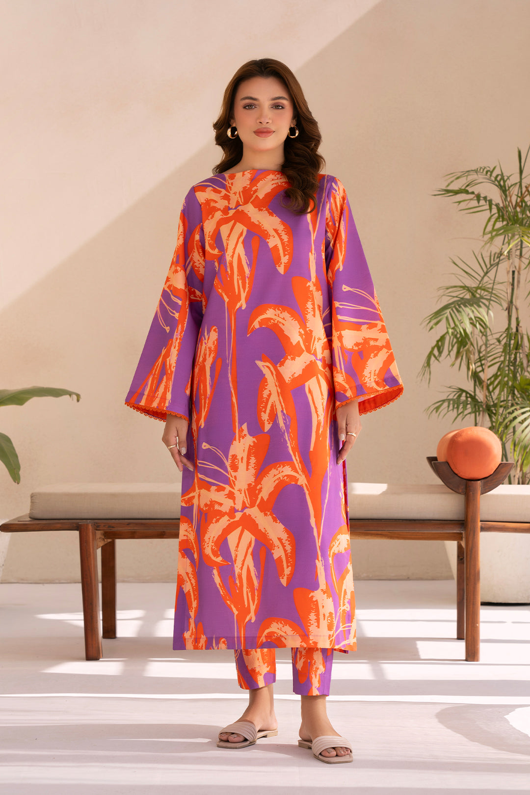 Effortlessly chic, this digitally printed long shirt features a graceful boat neckline and delicate lace-detailed sleeves, paired with a stylish printed trouser for a statement look.